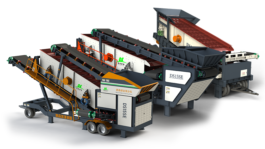 主要由轮胎式移动机架、重型双层滚筒筛、电控系统、电机、皮带机等组成。