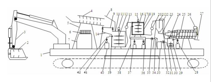 图中:1履带式压路机、2破碎铲斗、3挖掘臂、4粉碎机、5支架、6 控制台、7 控制集合柜、8 挡尘板、9 振动筛、10 制浆仓、11 第一电机、12 第一搅拌机、13 第一泥浆泵、14 收集仓、15 第二电机、16 第二搅拌机、17 淋洗仓、18 加热层、19 保温层、20第二泥浆泵、21 抽液管、22 浓密机、23 第一泥浆管、24 出液管、25 泥浆分离机、26 第三电机、27 第二泥浆管、28 重金属处理剂储存罐、29 第三搅拌机、30 第四电机、31 一次沉淀池、32 第一抽液泵、33 二次沉淀池、34 过滤器、35 第二抽液泵、36 回收储存罐、37 淋洗液储存罐、38药剂柜、39 水剂喷头、40 水剂存储罐、41 流量计、42 第三抽液泵。